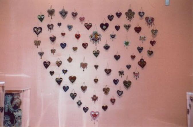These are heart-shaped pincushions displayed in the shape of a heart.
