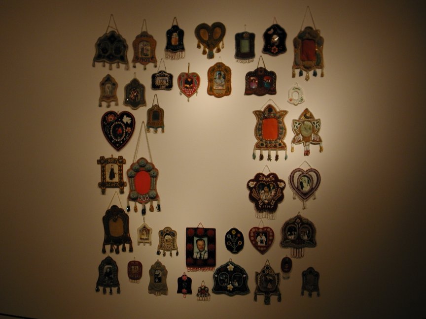 Iroquois beadworkers. Many have beaded dates, place names, and sayings